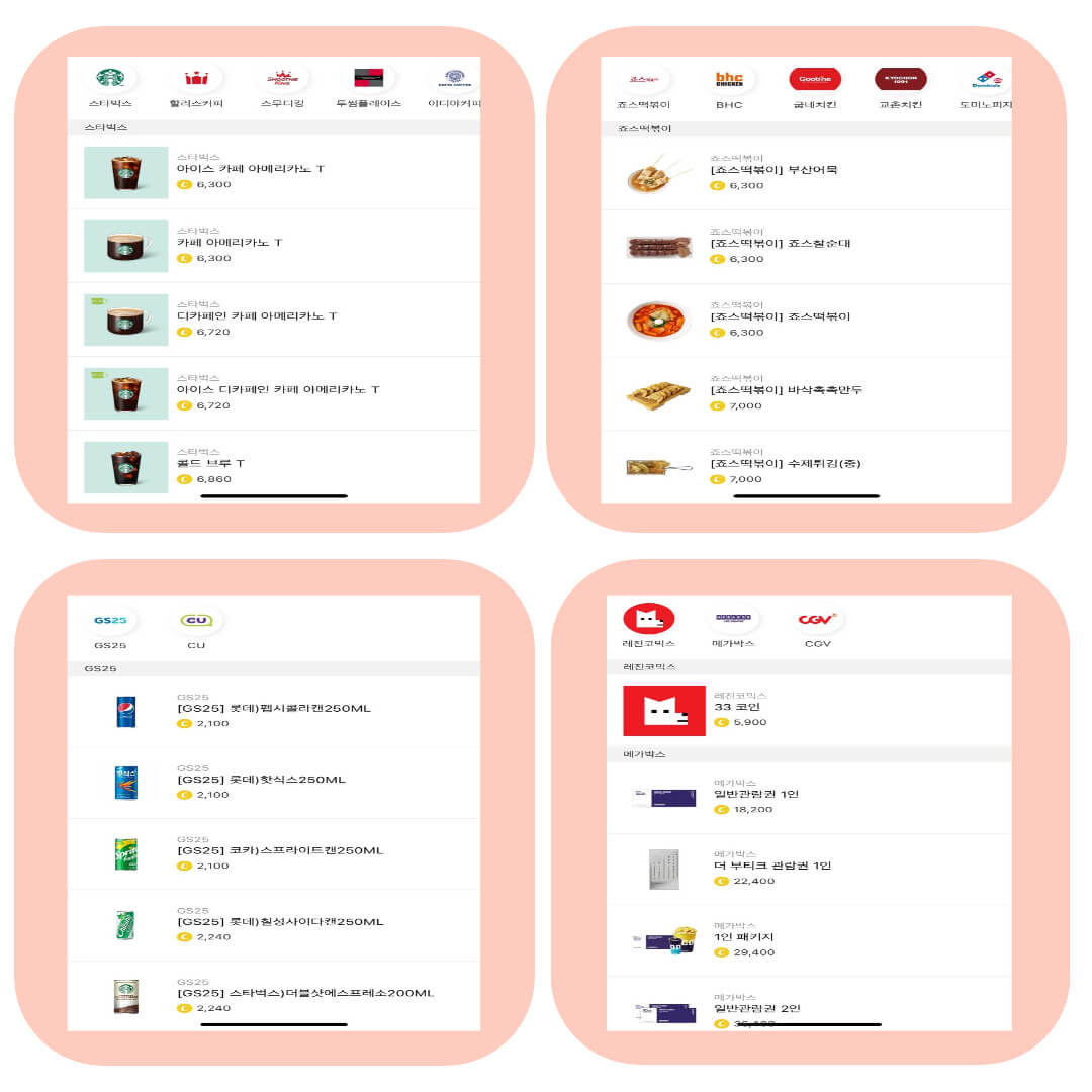 - 모바일교환권 : 커피숍 이용권, 치킨, 피자, 햄버거 이용권, 편의점 이용권, 영화 이용권