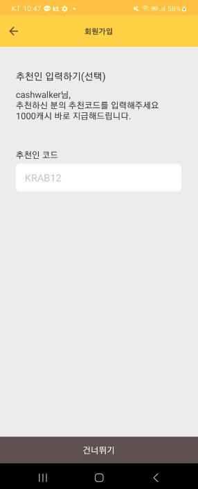 캐시워크 가입 마지막 단계에 추천인 코드를 입력하는 칸이 나옵니다.