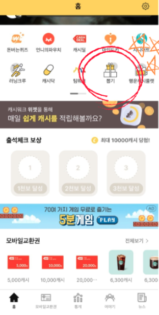 캐시워크 홈 화면 상단에 보면 "뽑기"라는 창이 있는데요.