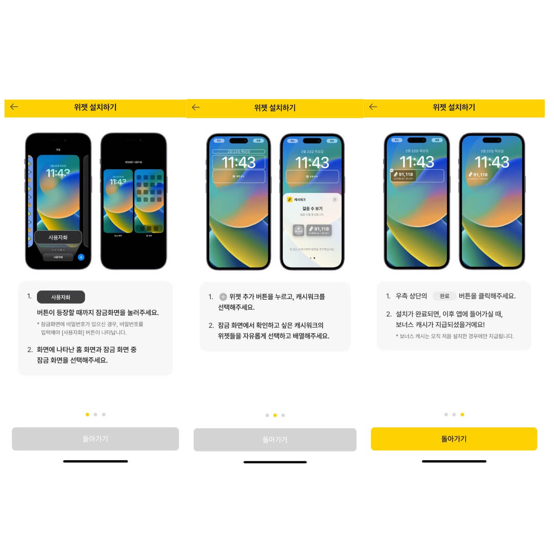 캐시워크 위젯을 설치하면 내가 하루 동안 걸은 횟수를 잠금화면에서 확인하실 수 있습니다.