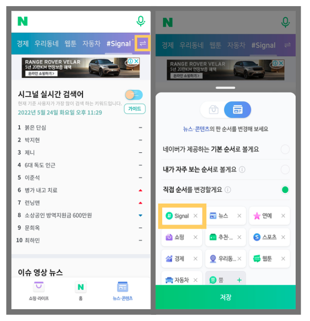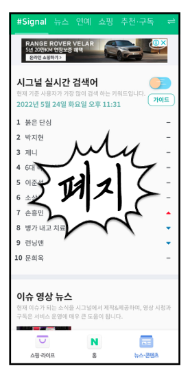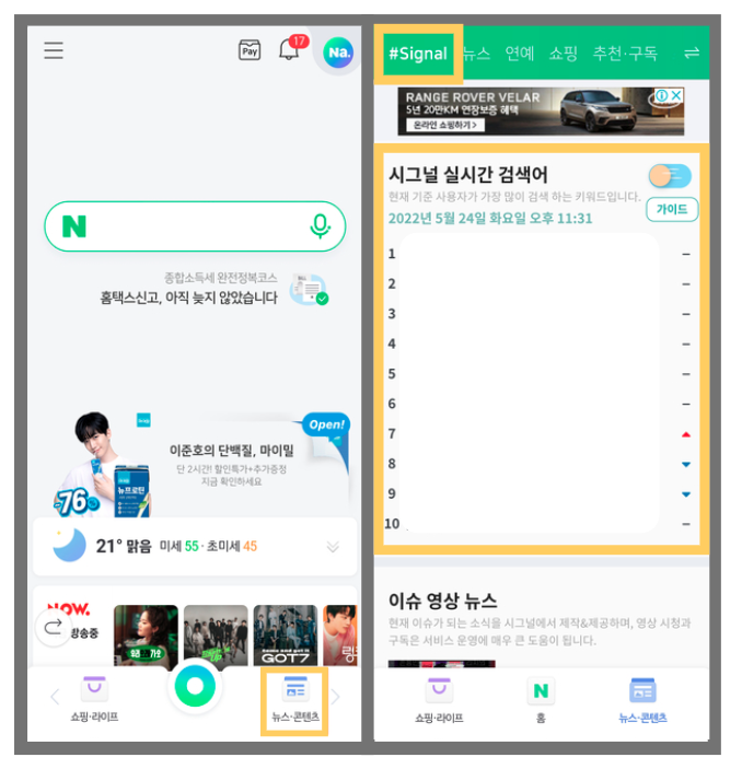 ⑦. 뉴스 콘텐츠 → 시그널 → 실시간 검색어 순위 확인