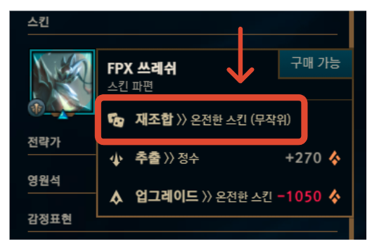 또한 재조합으로 얻게 되는 스킨은 보유 중인 챔피언의 스킨만 나오기 때문에