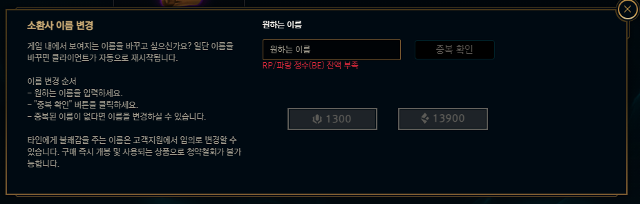 바로 이렇게 소환사 이름 변경 페이지가 뜨게 됩니다!