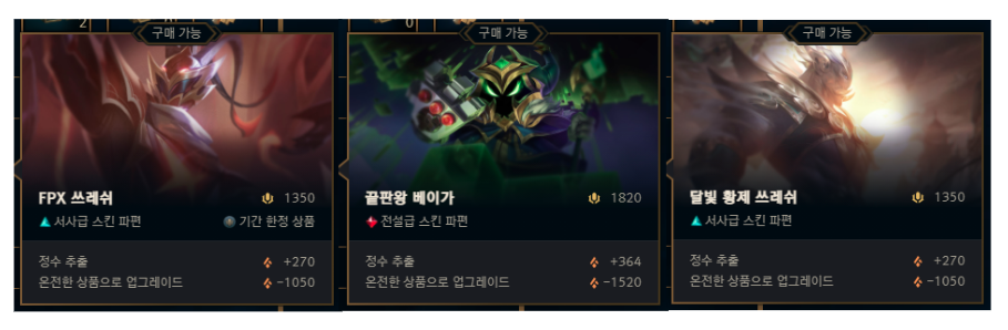 온전한 스킨으로 업그레이드를 안 한 스킨 3개를 재조합하여 새로운 스킨으로 얻으실 수 있습니다.