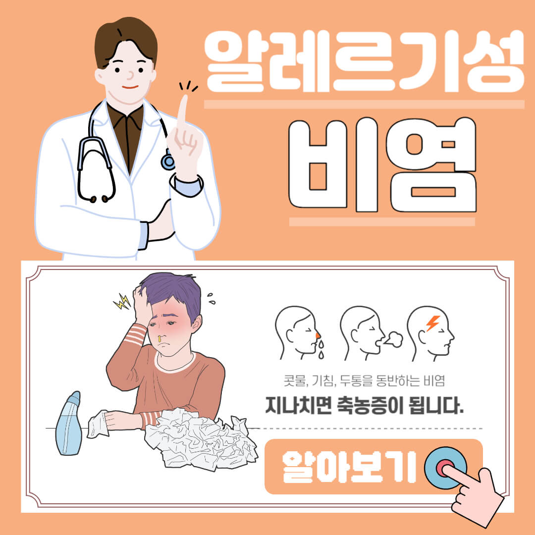 - 알레르기 비염은 주로 코와 주변 지역에 나타나는 다양한 증상으로 나타납니다. 가장 기본적인 코막힘 증상이 보이게 됩니다. 코에 농이 많아 구멍이 막혀 숨 쉬기가 어려워지는 증상으로, 머리가 무거워지고 수면에 직접적인 영향을 줄 수 있습니다. 더불어 코에 이물질로 인하여 재채기가 날 수 있는데 이러한 증상들은 공기 중에 먼지, 꽃가루, 동물 털 등등 알레르기 물질에 반응하여 나타나는 증상입니다. 기존보다 더 많은 콧물을 생성하기도 합니다. 알레르기 비염으로 인한 코 염증으로 인해 얼굴 주변의 통증이 발생할 수 있습니다. 코 안쪽 피부에는 자극이 많이 닿아 붉게 부어오르고, 염증 및 고름이 생길 수 있습니다. 알레르기 비염은 때로 특정 계절 또는 환경 변화와 연관이 있어 계절성 또는 일부분에만 증상이 나타날 수 있습니다. 또한 지속적인 코막힘은 호흡 곤란을 유발할 수 있어, 호흡을 원활하게 하기 위해 입으로 숨을 들이마셔야 할 수 있습니다. 재채기와 코에서 나오는 분비물을 제거하지 않으면 코막힘과 재채기 증상을 악화시킬 수 있습니다. 비염을 방치하면 심각한 합병증인 축농증으로 진행할 수 있습니다. 축농증은 비염의 심화된 상태로, 비강 내의 부비강에 염증이 생겨 농양이 발생하는 상태를 나타냅니다. 축농증은 비염 증상을 악화시키며, 강한 통증, 두통, 고열, 안면 붓기 등이 나타납니다. 압력으로 인해 주변 조직과 신경이 자극되어 통증이 발생됩니다. 따라서 알레르기 비염 증상을 조기에 인식하고 치료하지 않으면 축농증으로 변화할 수 있어 즉시 치료받을 수 있도록 관리해야 합니다.