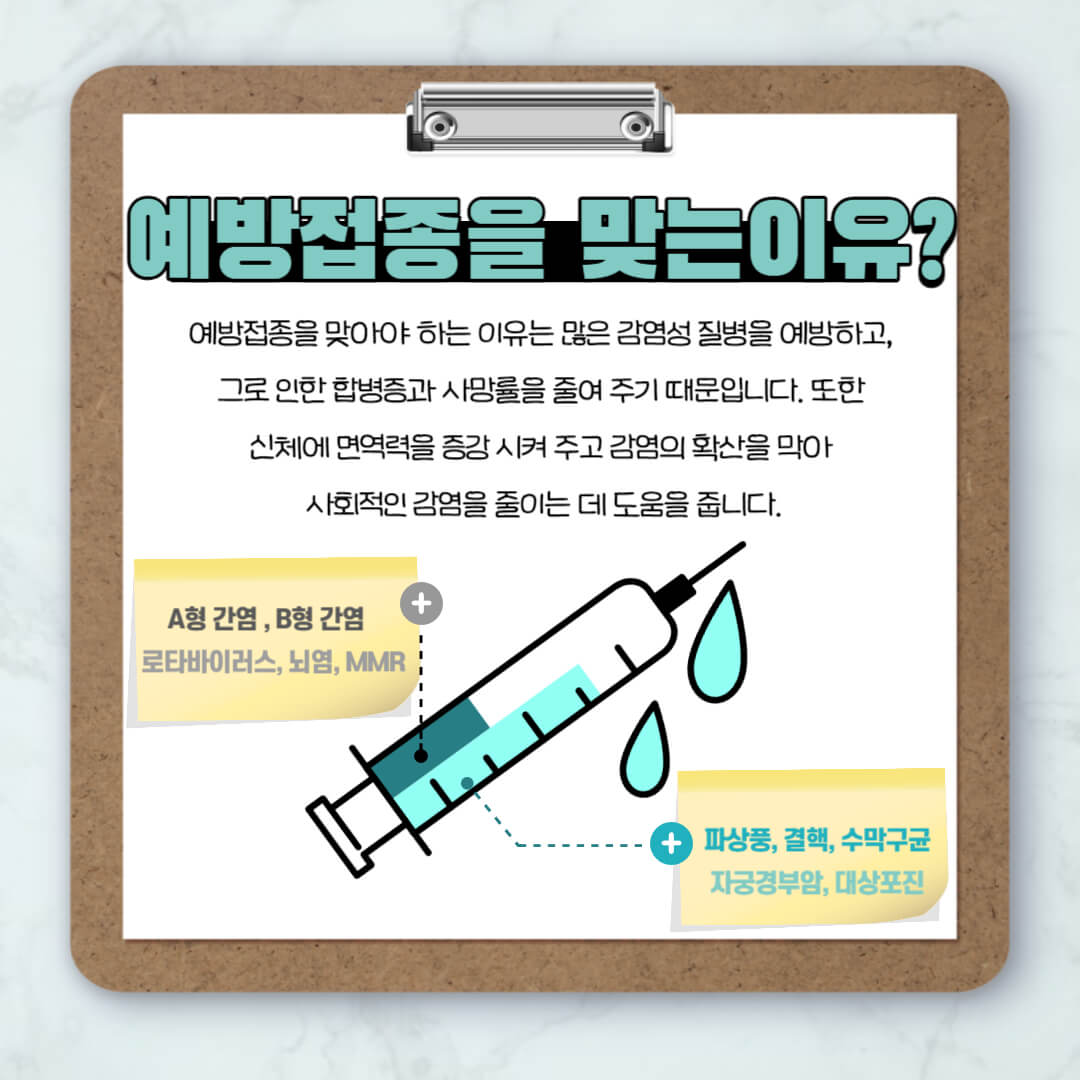 예방접종을 적절한 시기에 맞아 질병에 예방할 수 있도록 합시다.