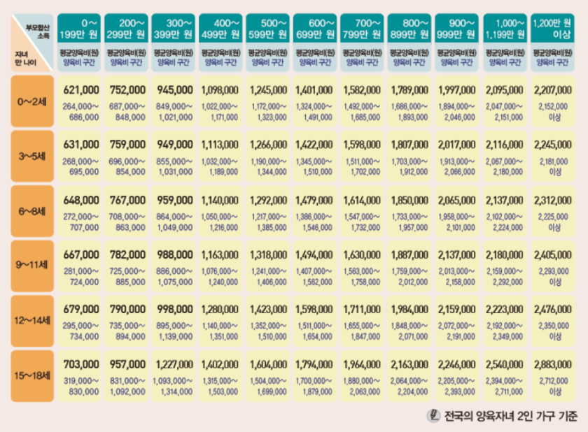 양육비를 산정하기 위해서는 자녀의 나이와 부모의 합산 소득을 확인해야 합니다.