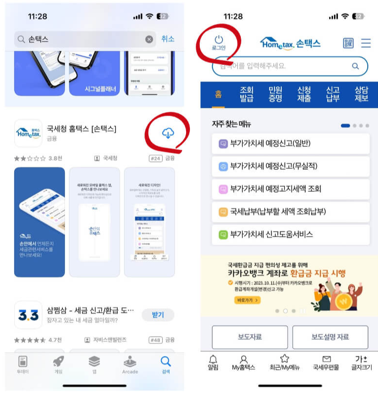 ①. 스토어에서 홈택스 검색 후 다운로드를 실행합니다.