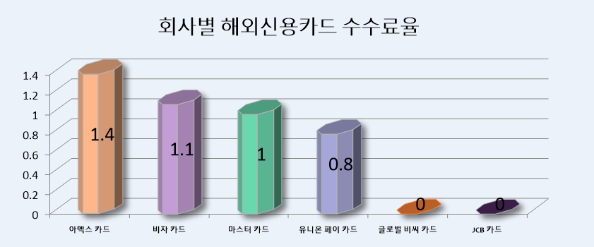 해외에서 널리 사용되는 카드는 1~1.4%의 수수료를 부과하고 있습니다.
